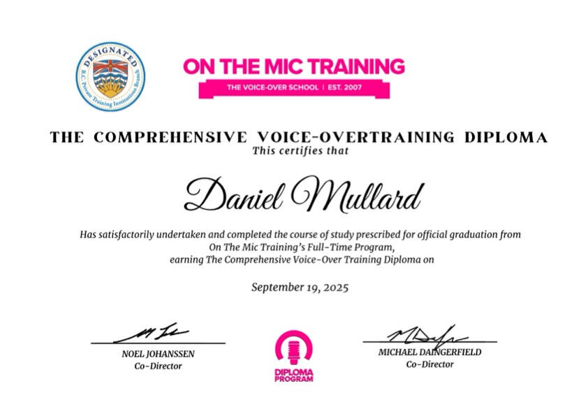 Daniel is a graduate of On the Mic Training’s Voice Over Acting program.Born and raised in Vancouver, he also holds a Degree in Tourism Management and has travelled the world with Celebrity Cruises, lived in Australia, and worked at Walt Disney World in Orlando.Now, he’s thrilled to channel his passion for storytelling into voice acting. With a lively, versatile sound — Daniel brings energy and imagination to every project, making him a strong addition to any roster.He is equal parts Charming, Cheeky, & Magical — 100% Daniel